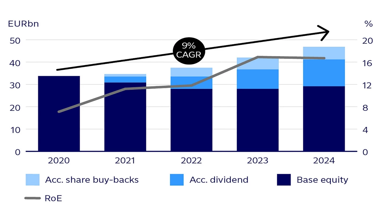We have paid out 11.9 billion euros in dividends over the past five years – and were one of the first banks in Europe to start implementing share buy-backs in 2021. In 2024 our earnings per share was EUR 1.44, a 5% increase from 2023.