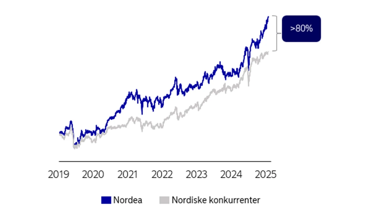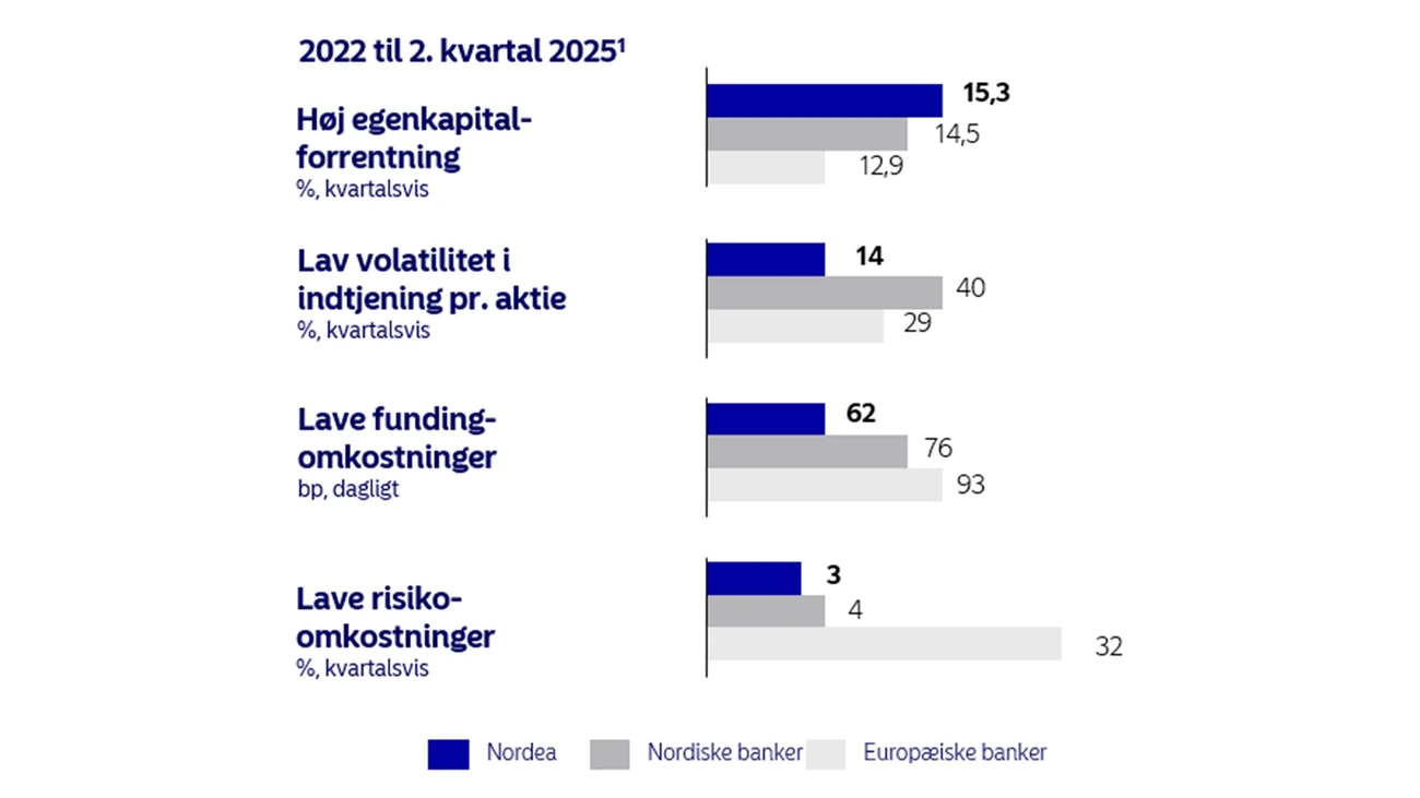 1. Kvartalsvise data for 2022 til 2. kvartal 2025; udvalg af 5 nordiske og omkring 30 europæiske banker (undtagen for fundingomkostninger, hvor vi sammenlignede risikopræmierne ved nyudstedelse af 5-årige privilegerede seniorobligationer i EUR for 5 nordiske og de 11 mest sammenlignelige europæiske banker)