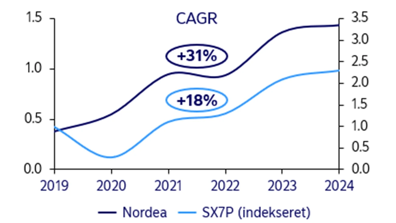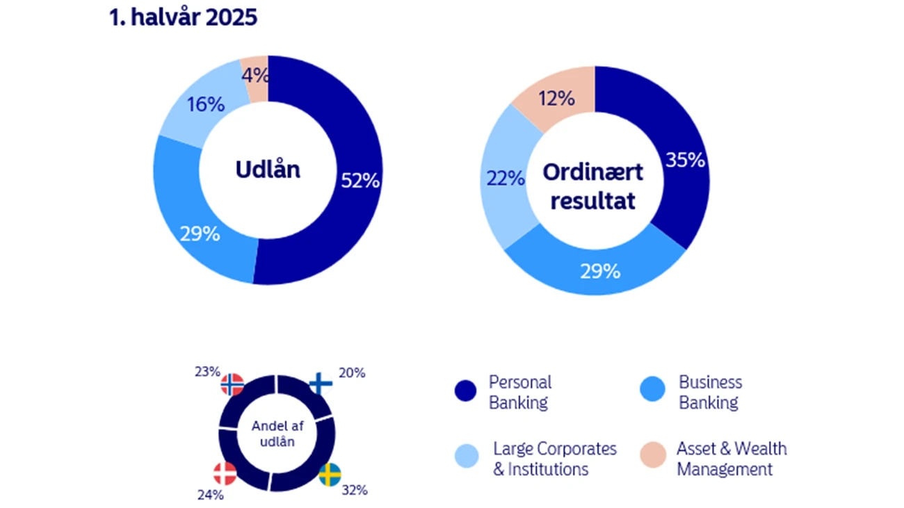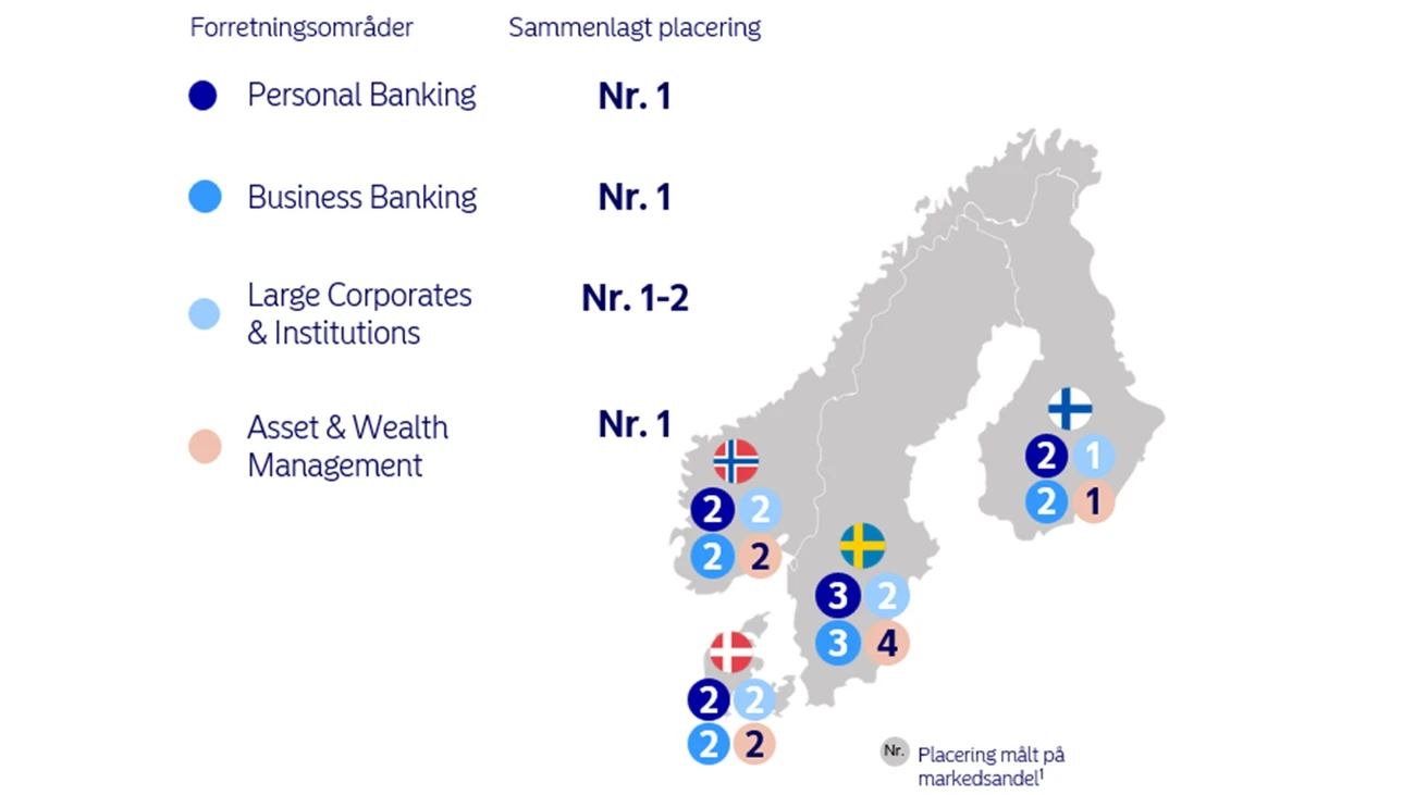 1. PeB: sammenlagt placering for realkreditlån, indlån og investeringsprodukter målt på volumen. BB: placering målt på indlån. LC&I: sammenlagt placering for udlån, indlån, transaktions- og valutaydelser målt på volumen. AWM: Private Bankings aktiver under forvaltning (AuM) (Life & Pension: DK: nr. 4, FI: nr. 2, NO: nr. 2 og SE: nr. 2). Data for helår 2024