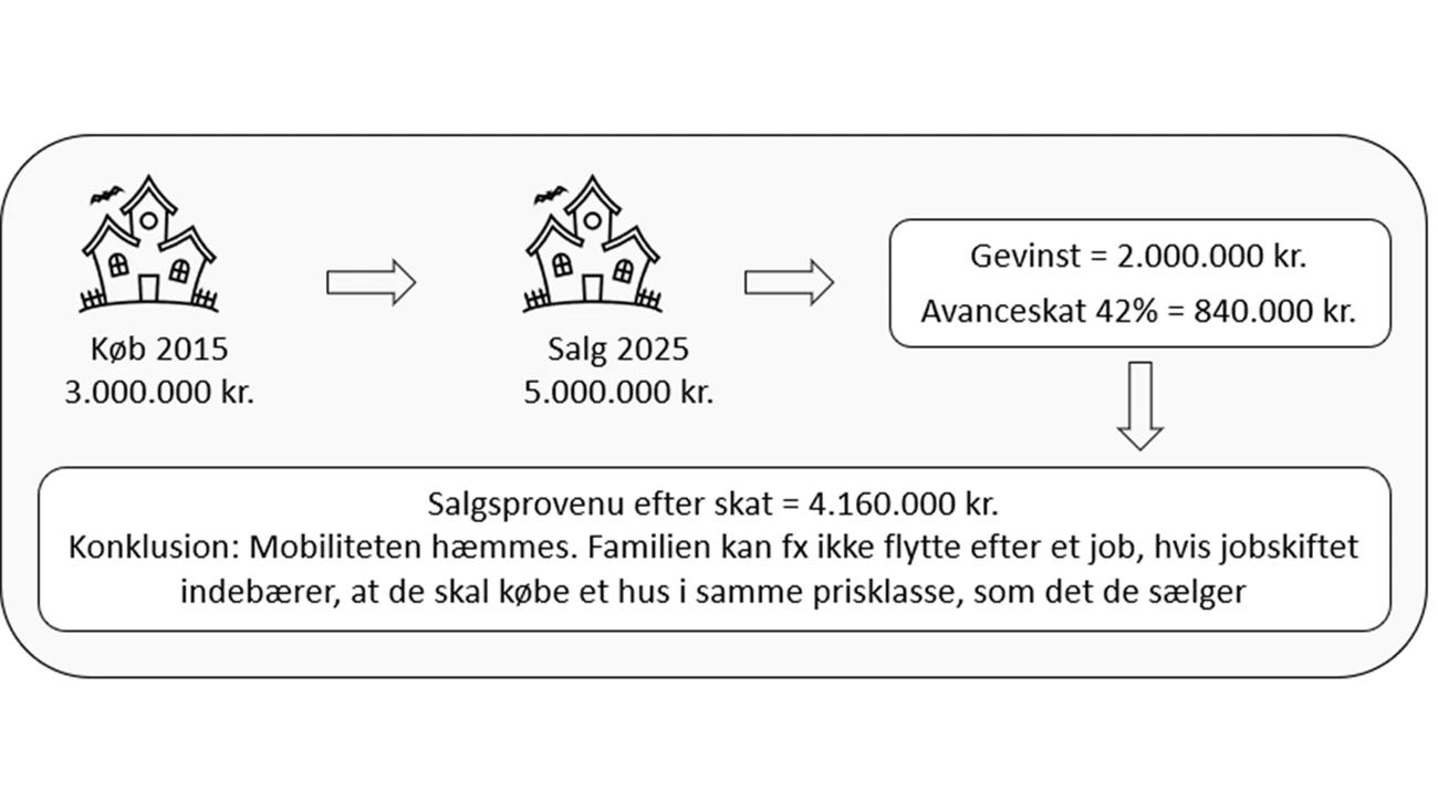 Huset kan sælges for 5 mio. kr., hvilket indebærer en avanceskat på 840.000 (42 pct. af 2 mio. kr.). Kombineret med de øvrige omkostninger til ejendomsmægler, staten og bankerne kan familien hurtigt stå i en situation, hvor der koster over 1 mio. kr. at flytte. Hvis familien ikke har råd til et større lån, kan det derfor skabe indlåsningseffekter og hæmme mobiliteten på bolig- og arbejdsmarkedet, da familien kun kan flytte, hvis de er villig til at acceptere et billigere hus.