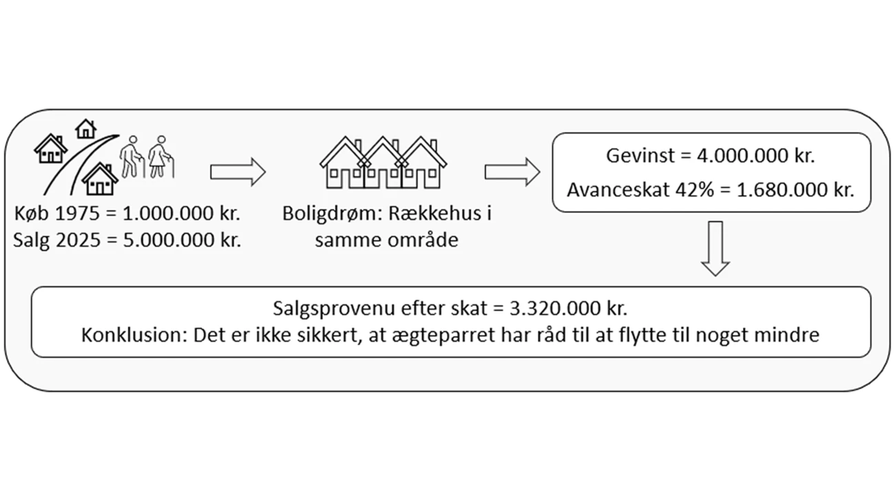 Et andet eksempel er det ældre ægtepar, der for 50 år siden købte hus for 1 mio. kr., og hvor huset kan sælges for 5 mio. kr. i dag. De ønsker at sælge til fordel for et mindre rækkehus til 4 mio. kr. i samme område.
