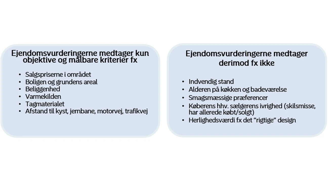 I dag medtager ejendomsvurderingerne kun objektive og målbare karakteristika som f.eks. salgspriserne i området, boligens og grundens areal, varmekilden, tagmaterialet og afstanden til f.eks. kyst og jernbane. Derimod medtages ikke forhold som indvendig stand, alderen på køkkenet, planløsningens brugbarhed eller den smukt anlagte have. Og vi ved alle sammen godt, at salgsprisen både afhænger af de målbare og indretningsmæssige karakteristika.