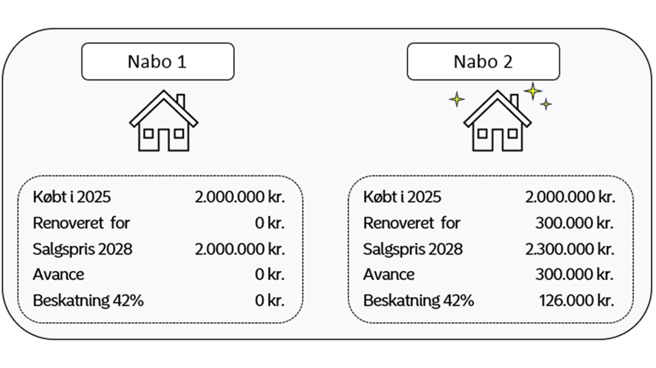 Den ene familie renoverer huset for 300.000 kr., mens den anden familie lader stå til. I 2028 sælges begge rækkehuse, men da boligpriserne er næsten uændrede i det valgte eksempel, sælges det renoverede rækkehuse for 2,3 mio. kr. og det ikke-renoverede rækkehuse for 2 mio. kr. I det tilfælde slipper familien, der ikke har renoveret rækkehuset, men en avanceskat på 0 kr., mens familien, der har brugt 300.000 kr. på at renovere rækkehuset, skal betale 126.000 kr. i avanceskat (42% af 300.000 kr.), selvom de ikke har haft en egentlig gevinst pga. deres renoveringsomkostninger.