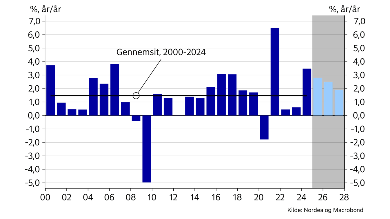 Efterfølgende er aktiviteten i dansk økonomi dog kommet stærk igen. Baseret på de nuværende nationalregnskabstal vurderer vi derfor, at den samlede aktivitet sidste år voksede med 2,8%. Fremgangen er ekstra bemærkelsesværdig, fordi den kommer efter en endnu stærkere fremgang i 2024. Vi forventer, at den solide vækst kommer til at fortsætte igennem indeværende år, hvor vi forudser en samlet vækst på 2,5%. Det er lidt højere end ventet i prognosen fra september sidste år. Endelig fastholder vi forventningerne om en fremgang på 1,9% i 2027.