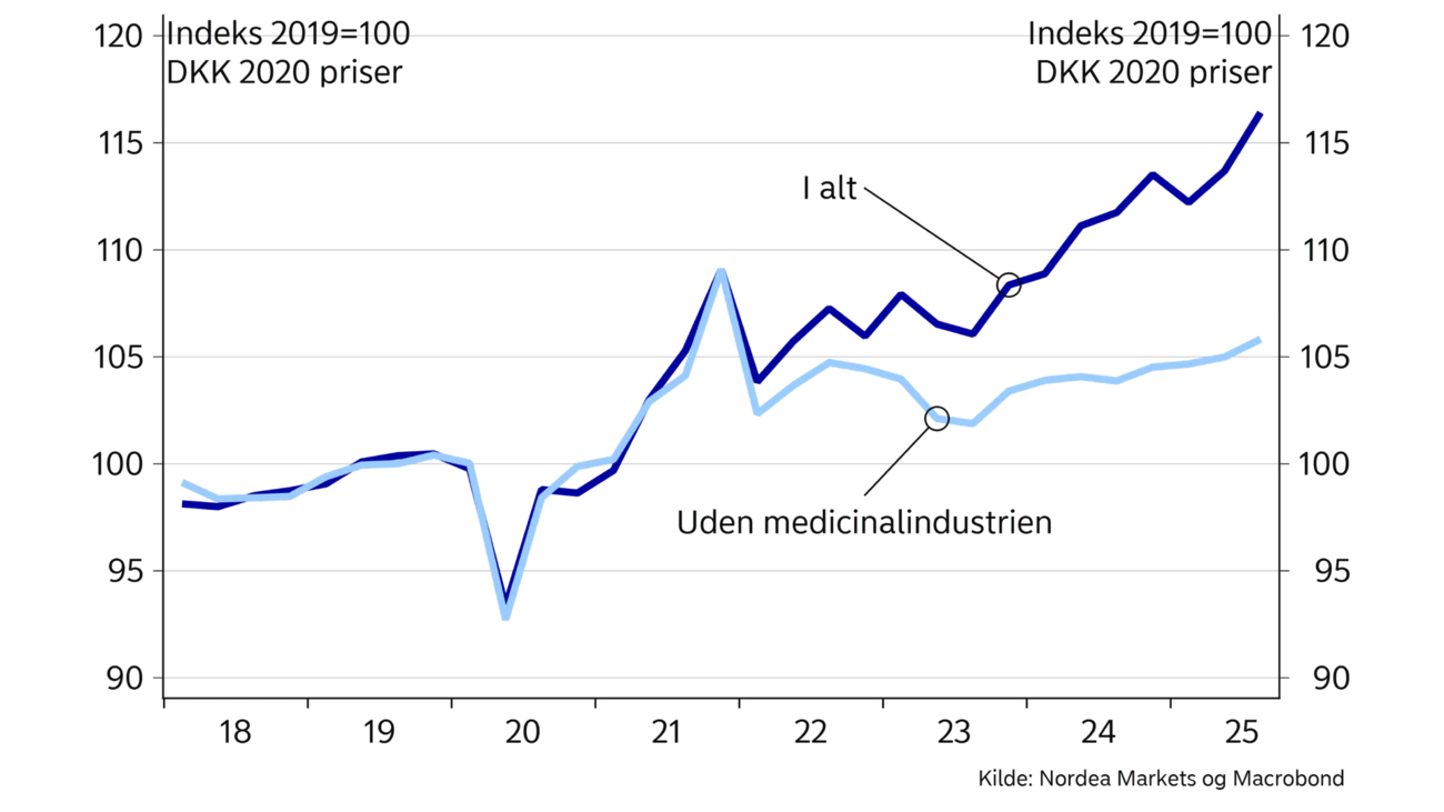 2025 var et turbulent år i dansk økonomi. Det skyldes især effekterne fra den store medicinalindustri, der yder et meget stort bidrag til den samlede fremgang i dansk økonomi. Sidste år startede med det største kvartalsvise fald i BNP siden 2023 og blev efterfølgende fulgt op af en kraftig nedjustering af de historiske nationalregnskabstal. Samlet ledte det til en noget mere afdæmpet vækstprofil for dansk økonomi end tidligere forventet. Det betød derfor også, at vi i den seneste udgave af Economic Outlook fra september 2025 måtte foretage en relativ stor nedjustering af vækstforventninger for året.