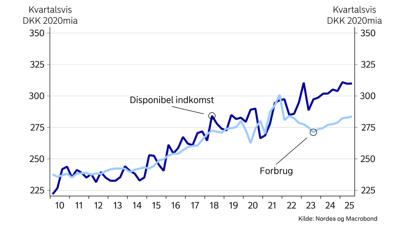 Set i det lys venter vi en årlig vækst i privatforbruget på 2,0-2,5%. Det vil i givet fald være den højeste vækst siden forbrugsboomet under Covid-19 pandemien i 2021 og vil dermed gøre forbruget til en større del af den samlede fremgang i dansk økonomi hen over prognoseperioden.