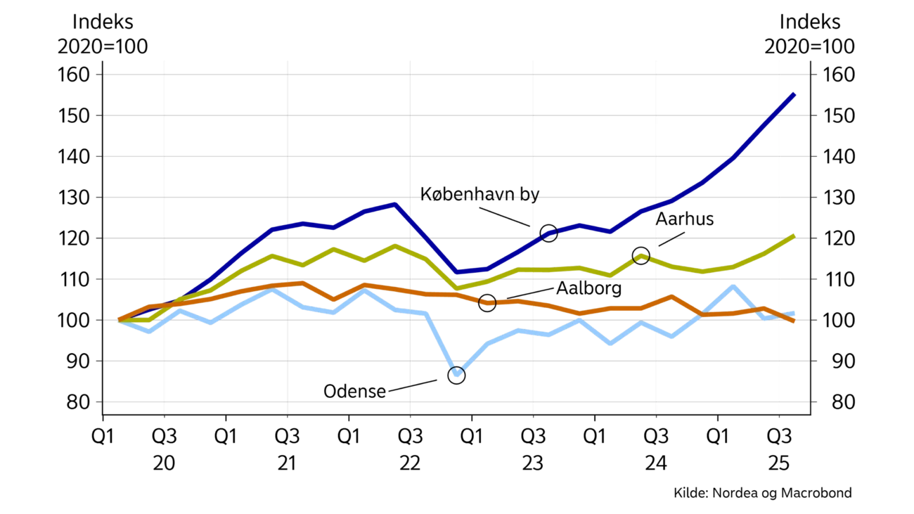 I prognosen forventer vi, at huspriserne i 2026 som gennemsnit vil stige med 5,3% efterfulgt af en fremgang på 3,6% i 2027. Også på markedet for ejerlejligheder forventer vi yderligere prisstigninger over de kommende år. De stigende boligpriser vil både blive trukket af den fortsatte fremgang på arbejdsmarkedet og den stigende købekraft i husholdningerne som følge af skattelettelser, afgiftsnedsættelser og højere realløn.