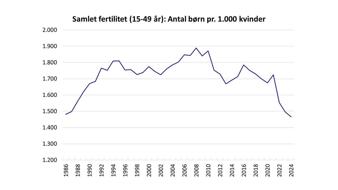 De seneste 15 år er fertiliteten i Danmark faldet mærkbart. I 2008 fik kvinder i gennemsnit 1,89 barn. Det var stadig under det niveau, der skal til for at opretholde befolkningstallet uden indvandring, men dog betydeligt højere end i dag. I 2024 var fertiliteten nemlig faldet til 1,47 barn pr. kvinde, og det er det laveste niveau siden Danmarks Statistik begyndte at måle i 1986.