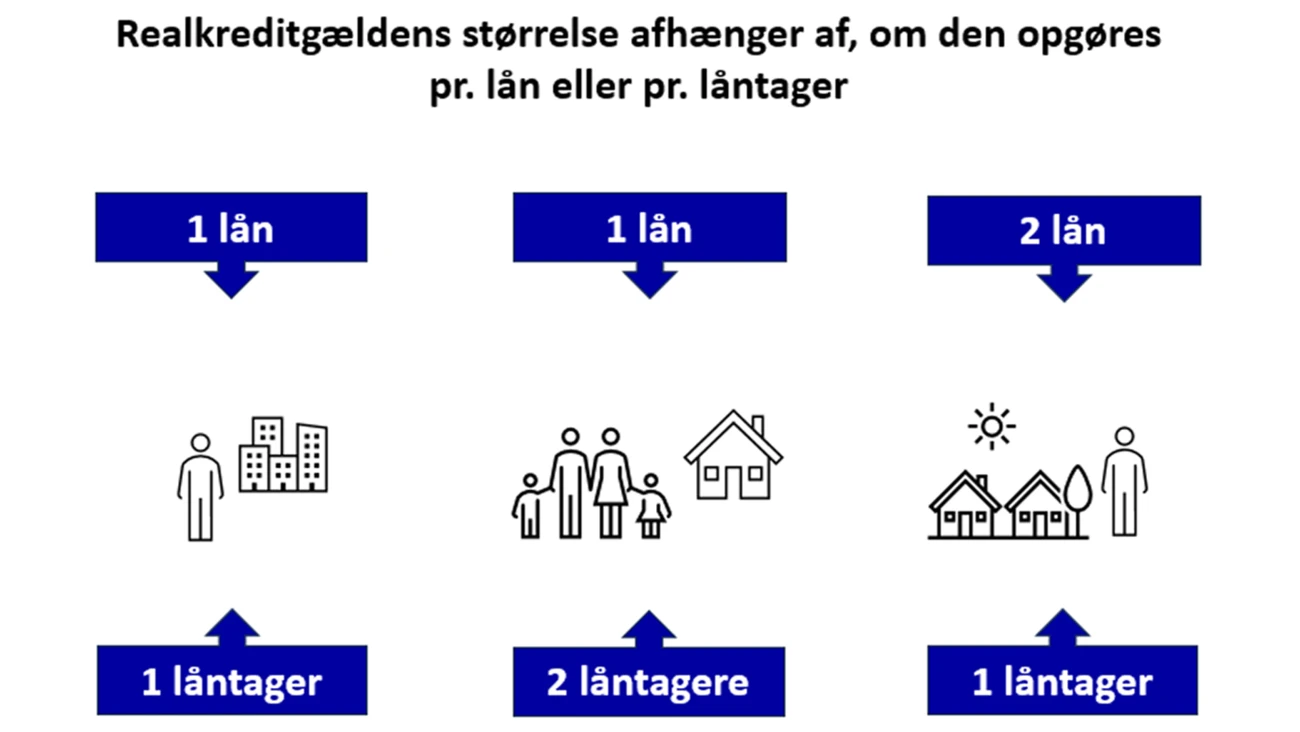 Opgjort pr. lån var den typiske restgæld på et realkreditlån, dvs. medianen, på lige præcis 1 mio. kr. ved udgangen af 2. kvartal 2024. Opgjort pr. låntager var den typiske restgæld dog 765.000 kr. Forskellen skyldes, at mange ejer deres bolig sammen med en partner og derfor også typisk deler gælden.