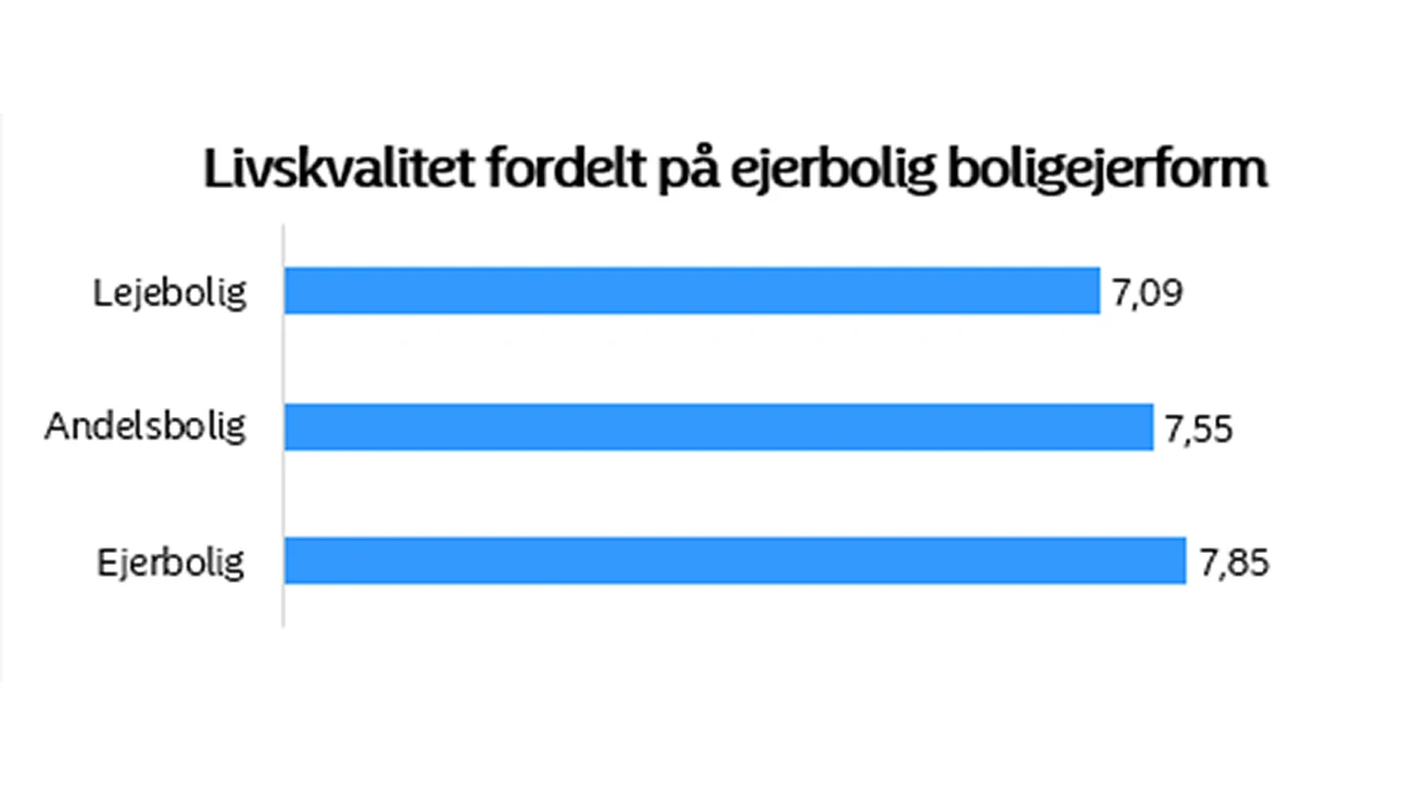 Også ejerformen har betydning. Internationale studier – og RealDanias danske analyse – viser, at boligejere generelt har højere livskvalitet end lejere. Årsagen er blandt andet friheden til selv at bestemme over eget liv, hvor ejere for eksempel nemt kan rive en væg ned, fjerne hegnet til fordel for en hæk eller anskaffe sig et kæledyr uden at skulle spørge udlejer om lov eller følge et reglement fra foreningen.