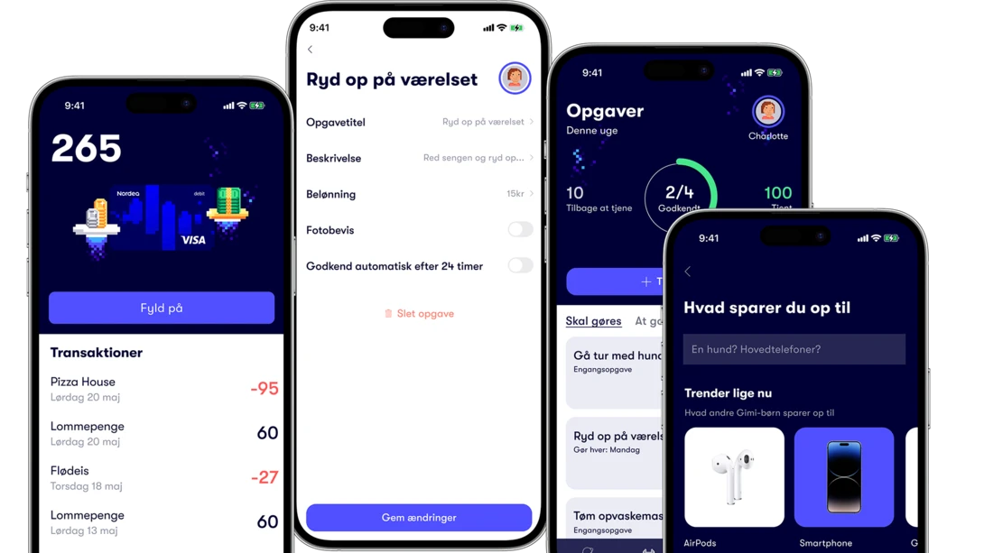 Gimi er en app, der hjælper børn med at forstå penges værdi gennem praktisk læring. Appen kombinerer opsparing, opgaver og lommepenge på en pædagogisk måde, så dit barn får overblik over sin økonomi.