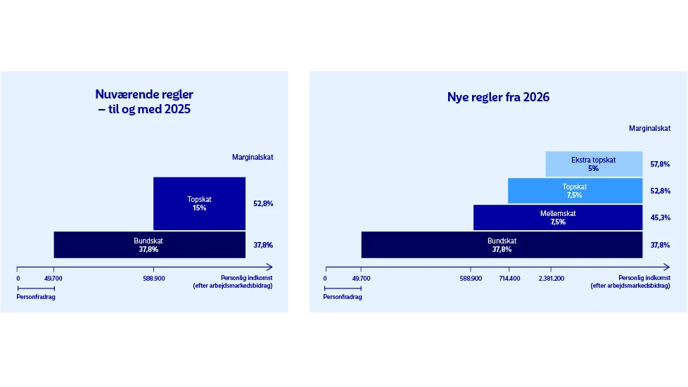 Hvis du i dag betaler bundskat, fordi du har en løn under 640.400 kr., har de nye regler ingen betydning for din indbetaling til pension. Men hvis du betaler topskat i dag, er de nye regler interessante – især for dig, der lander i mellemskat-gruppen fra 2026, hvor den helt store ændring ligger.