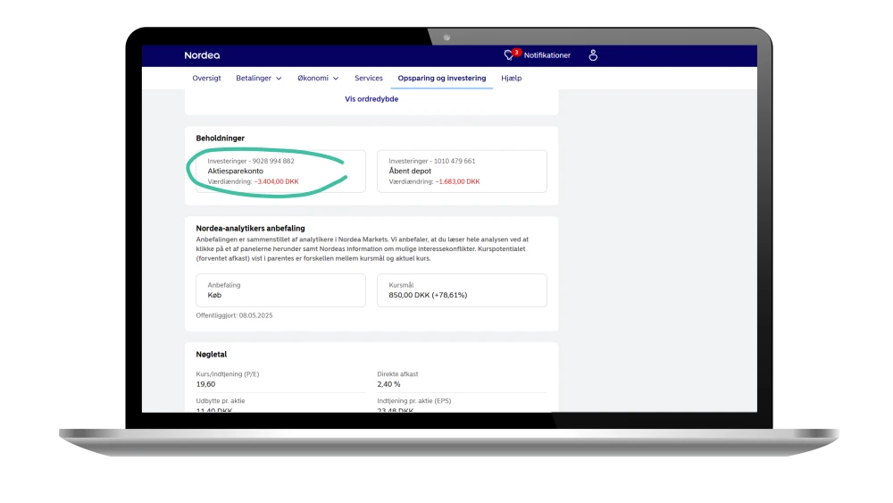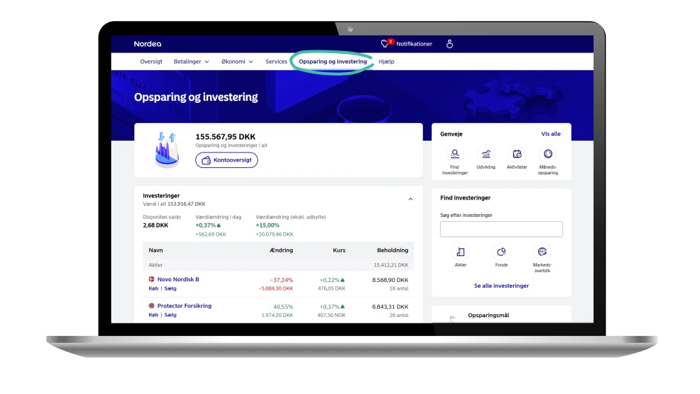 Vi forbedrer løbende mobil- og netbanken og udvider med flere og flere funktioner inden for området "Opsparing og investering". Du vil i den kommende tid opleve, at funktioner, som du tidligere kun havde adgang til i Nordea Investor, også vil blive tilgængelige i din mobil- og netbank.