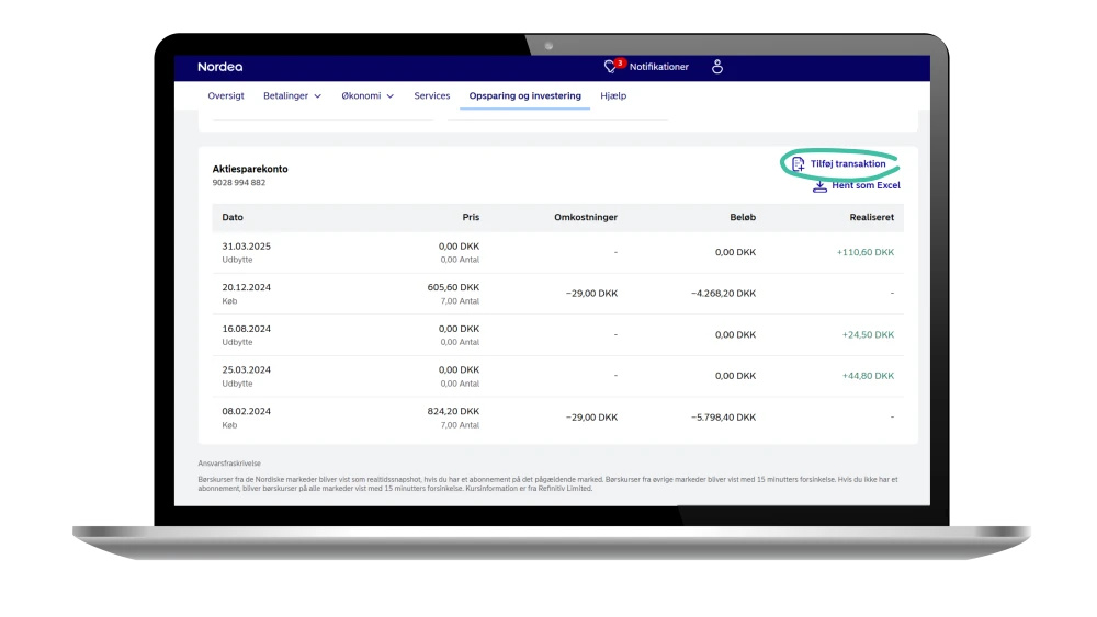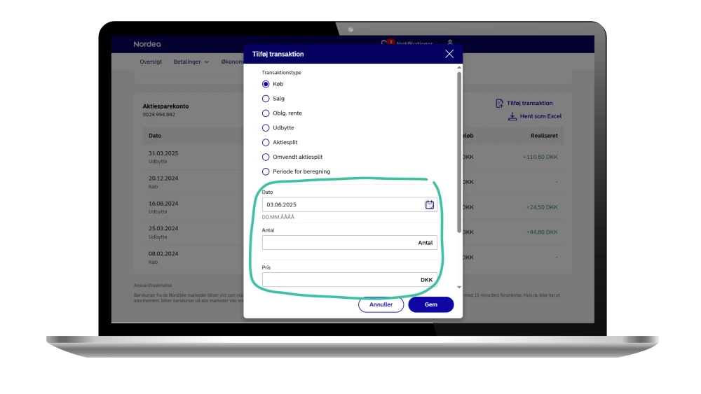 Vi sørger selvfølgelig for automatisk at lægge alle de oplysninger ind, vi allerede har om dine papirer og handelshistorik, men der kan være få tilfælde, hvor det kan være vigtigt, at du laver manuelle ændringer, for at kunne se din værdiudvikling på det specifikke værdipapir. Det kan være, hvis der foretages et aktiesplit, virksomheden udsteder nye værdipapirer for at rejse kapital (også kaldet en emission), eller hvis du har investeret i en virksomhed, som fusionerer med et andet selskab. Vi giver dig selfølgelig besked i din mobil- og netbank, hvis det er aktuelt og nødvendigt for dig at rette i 'gevinst og tab'.