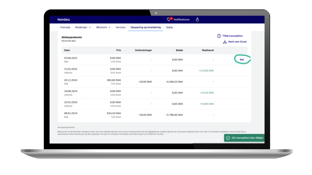 6. Har du brug for at tilrette de informationer, som du tidligere har indtastet, kan du klikke på ”ret” og foretage justeringer i den tilføjede transaktion. Ved at klikke på ”ret”, får du også mulighed for at slette transaktionen helt.