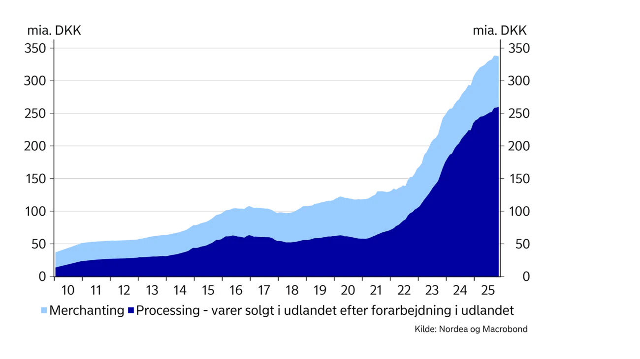 Den del af vareeksporten, der ikke krydser grænsen opdeles i to kategorier. Den ene er såkaldt ”processing”, der dækker over varer, som efter forarbejdning af en dansk virksomhed, sælges i udlandet. Den anden kategori  er ”merchanting”, hvor handelsvarer købes og sælges i udlandet. Tilsammen har de to kategorier alene over det seneste år genereret indtægter for ca. 340 mia. kroner. Det svarer til mere end en fjerdel af den samlede danske vareeksport i den periode.