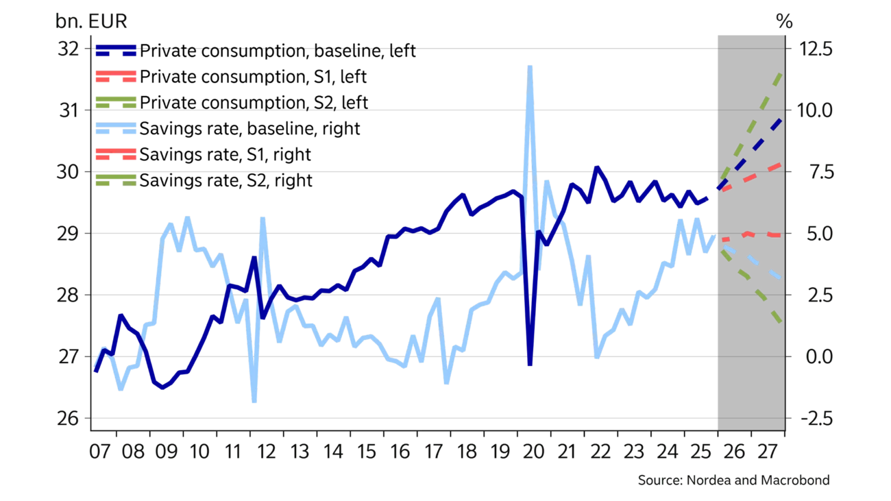 In the second scenario (S2), we look at economic growth in a situation in which the savings ratio falls faster than the baseline, dropping to the long-term average of ~2% in 2027. This would bring a total of 1pp more GDP growth than in the baseline. The GDP growth calculation takes into account that increased consumption boosts imports by a factor of 0.25 and that faster economic growth accelerates employment by a factor of 0.75, which is reflected in disposable income growing faster than in the baseline.