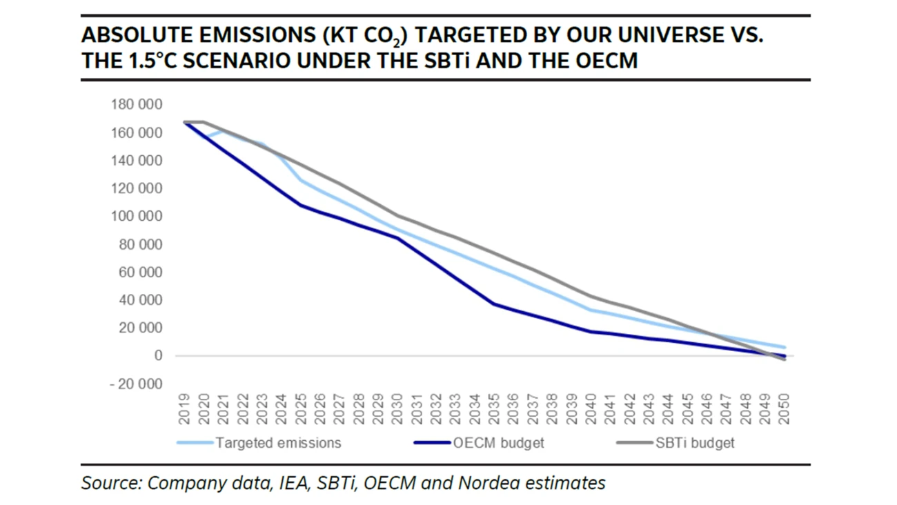 If achieved, the companies’ targets point to an implied temperature rise of 1.5-1.7°C, assuming the global decarbonisation trajectory mirrored that of our Nordic universe. Factoring in Scope 3 emissions complicates the picture: the implied temperature climbs to 2°C, and the likelihood of delivery falls substantially. But we see most companies actively trying to address this gap.