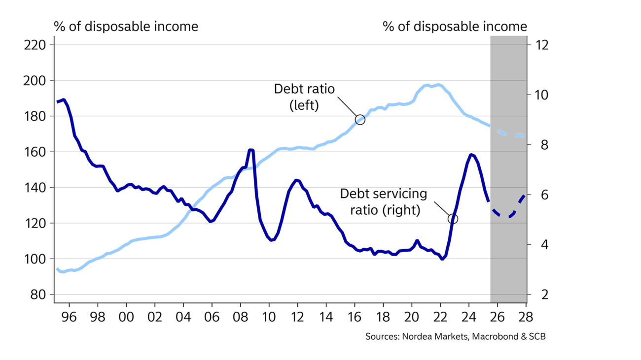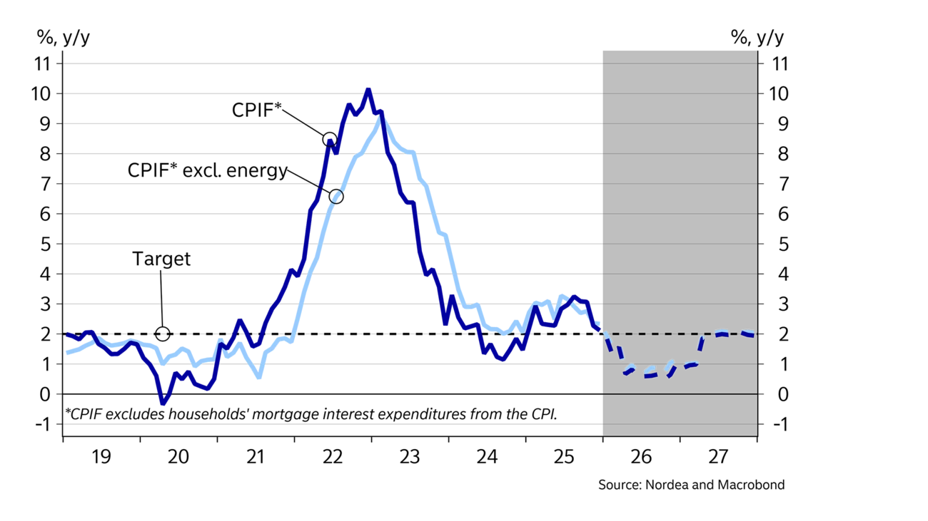 Although it is uncertain how a better economic climate will affect inflation, the recovery still matters for the Riksbank. Low inflation is increasingly tolerated as long as the economy is growing and unemployment is falling. We thus expect the Riksbank to keep its policy rate on hold in 2026, with the first rate hike anticipated in early 2027.