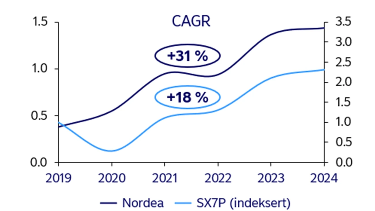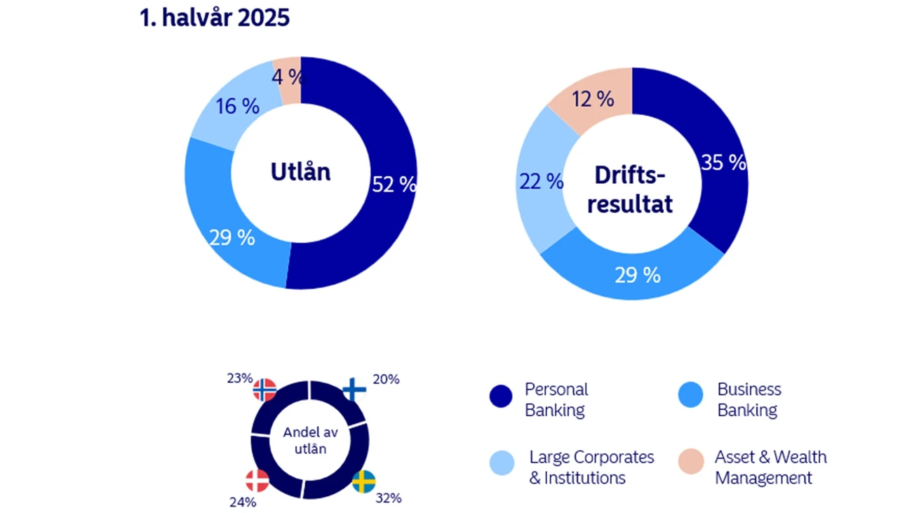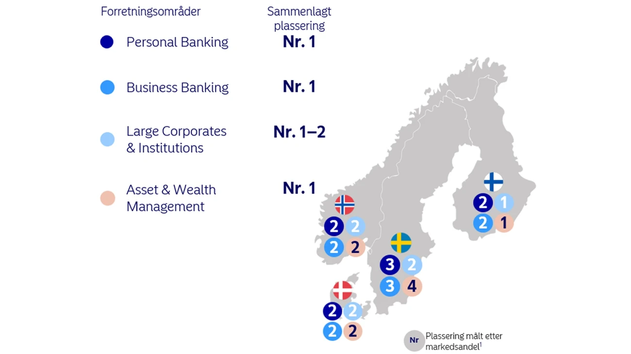 1. PeB: sammenlagt plassering for boliglån, innskudd og investeringsprodukter målt etter volum. BB: plassering målt etter innskudd. LC&I: sammenlagt plassering for utlån, innskudd, transaksjons- og valutatjenester målt etter volum. AWM: Private Bankings midler til forvaltning (AuM) (Life & Pension: DK nr. 4, FI nr. 2, NO nr. 2 og SE nr. 2). Data for hele året 2024.