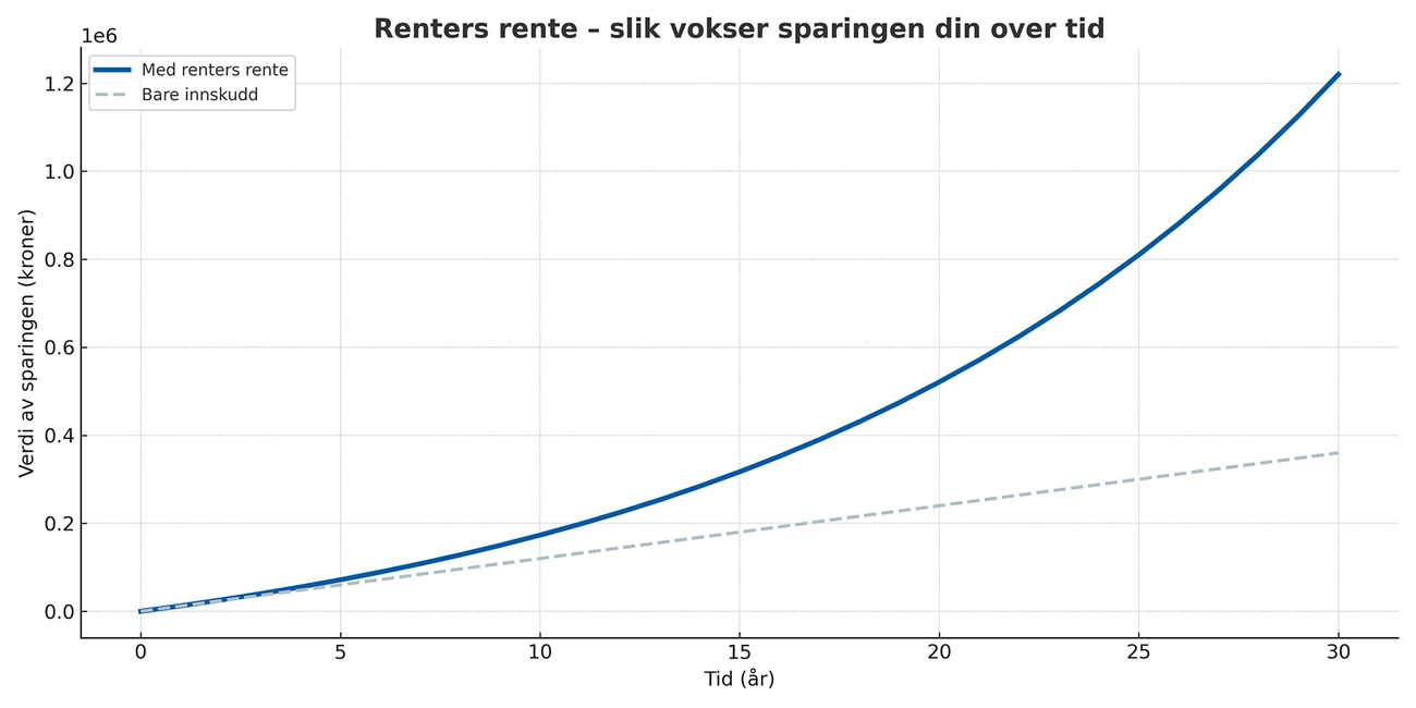 Den prikkede linjen viser hva du får hvis du bare satte inn 1 000 kroner per måned uten avkastning, mens den blå kurven viser spareverdi med renters rente. Etter 30 år vil det grunnleggende sparebeløpet ditt, som kun var 360 000, ha vokst seg til over en million uten at du gjorde annet enn å spare regelmessig. For å gjøre det enda tydeligere, kan vi si at du får renter på hver krone du setter inn i sparingen, men uten renters renter. Da vil regnestykket se slik ut: