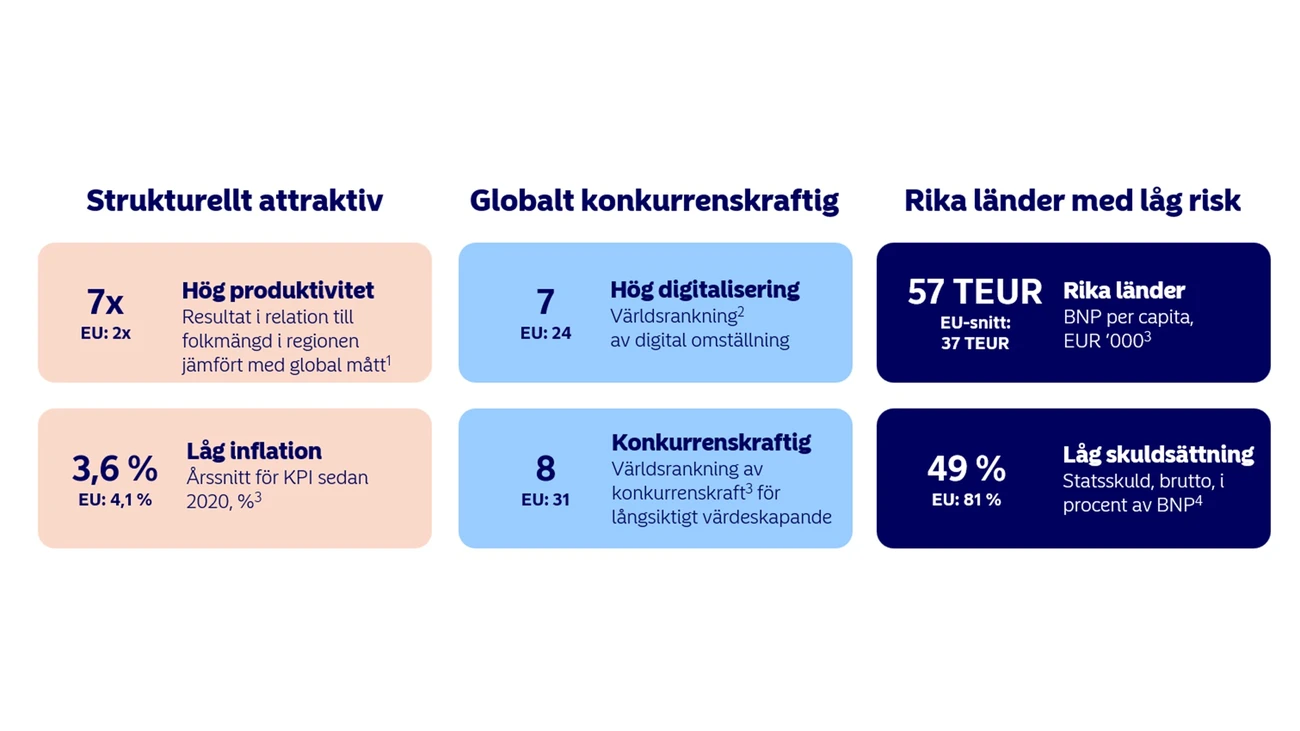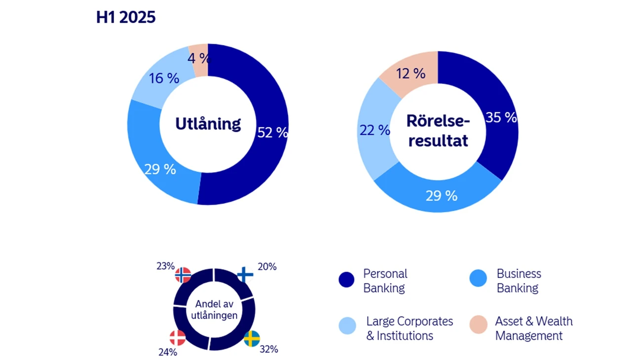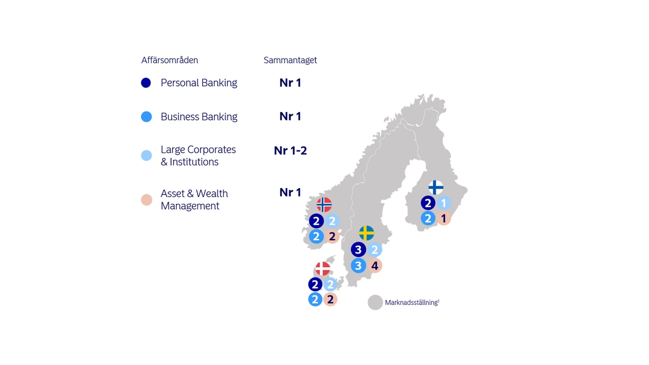 1. PeB: sammantagen marknadsställning för bolån, inlåning och investeringsprodukter sett till volym. BB: ställning på inlåningsmarknaden. LC&I: sammantagen marknadsställning för utlåning, inlåning, transaktions- och valutatjänster sett till volym. AWM: Private Banking, förvaltat kapital (Life & Pension: DK nr 4, FI nr 2, NO nr 2 och SE nr 2). Uppgifter för helåret 2024