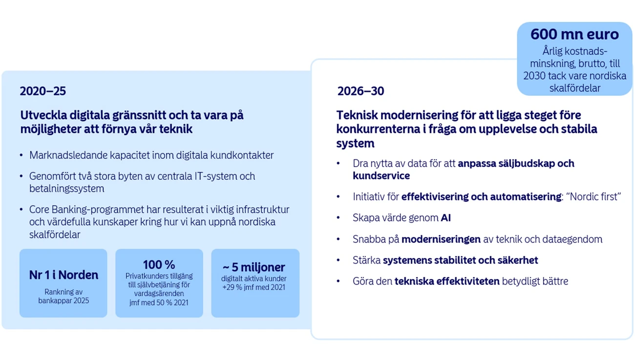 Nordea has updated its strategy and set new financial targets for the period 2026–30. Nordea’s strategy is aimed at delivering superior earnings per share growth, driven by profitable, faster-than-market income growth and significant improvements in cost efficiency.