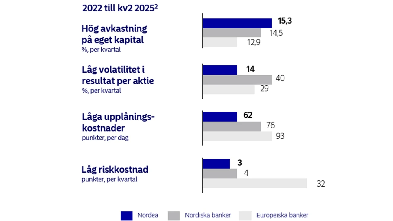 2. Kvartalsuppgifter 2022 till kv2 2025: urval av 5 nordiska och cirka 30 europeiska banker (utom för upplåningskostnader, där vi jämförde riskpremierna vid nyemission av 5-åriga seniora prioriterade obligationer för 5 nordiska banker och 11 mest jämförbara europeiska banker).