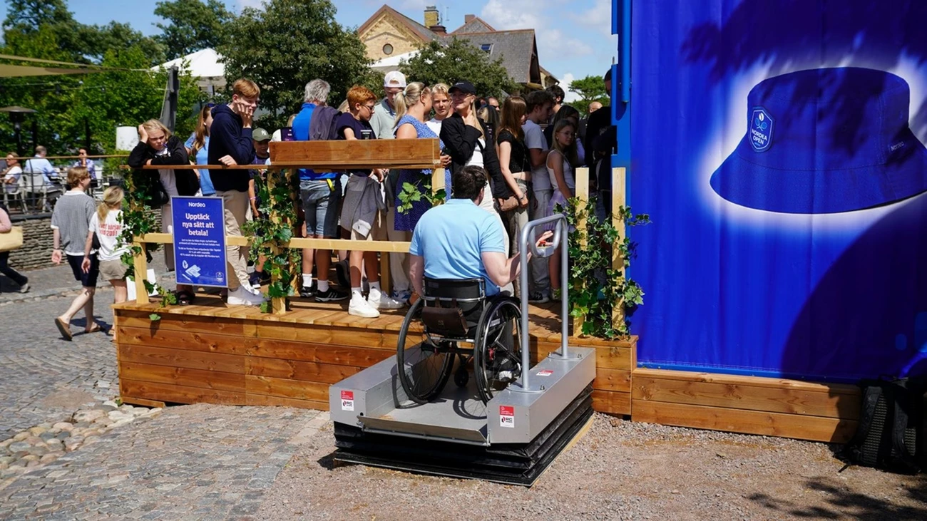 På gågatan i Båstad har det installerats en rullstolshiss under Nordea Open.