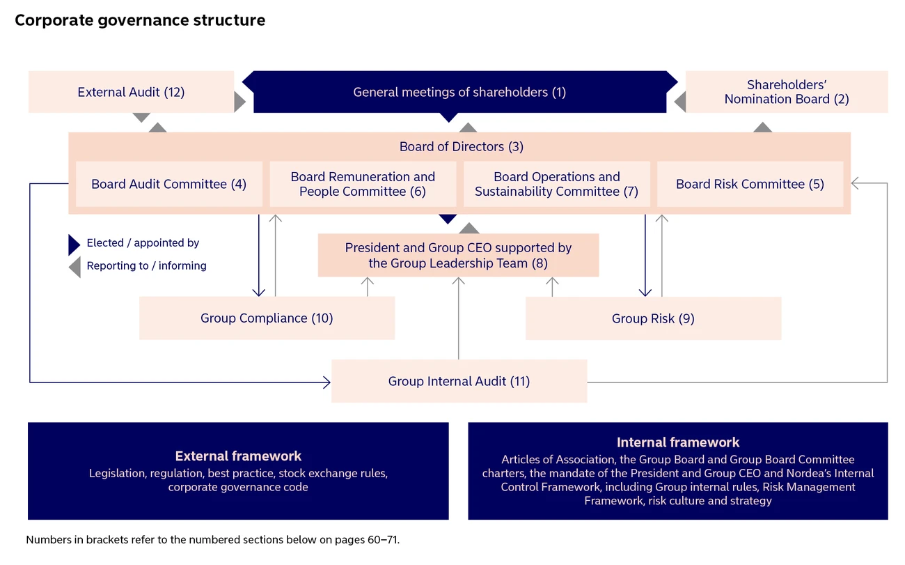Styrning och kontroll av Nordea fördelas mellan aktieägarna (på bolagsstämman), styrelsen och verkställande direktören tillika koncernchefen i enlighet med reglerna i det externa ramverket, bolagsordningen och de interna instruktioner som fastställts av styrelsen.